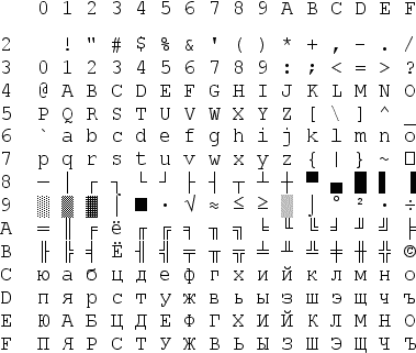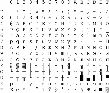 Кодировка 866 (альтернативная). Используется в системе MS-DOS, а также в текстовой консоли Windows. Русские буквы размещены на местах, не занятых символами псевдографики, используемых для рисования рамочек.