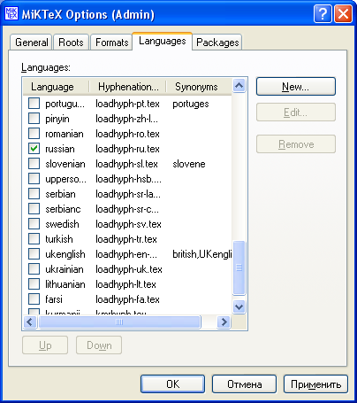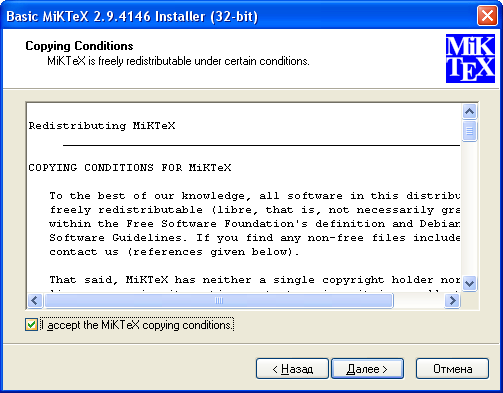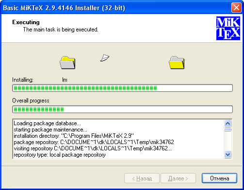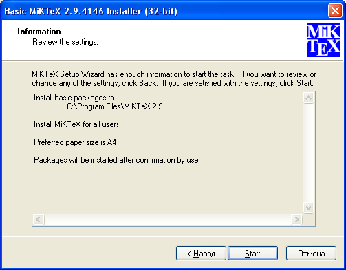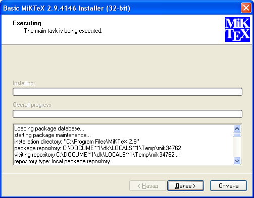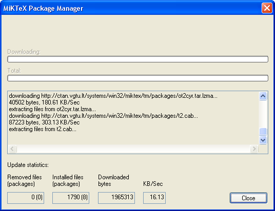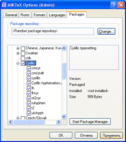 Установленная таким образом базовая система MiKTeX не содержит поддержки русского языка. Для установки поддержки русского языка необходимо подключение к интернету для скачивания пакетов русификации из сетевого репозитория.